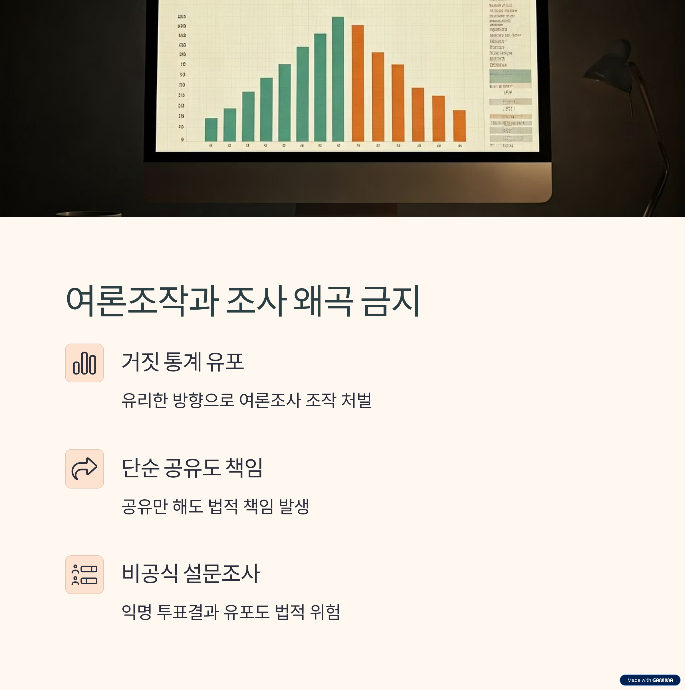 자신에게 유리한 방향으로 여론조사를 조작하거나 거짓 통계를 유포하는 행위도 처벌 대상입니다.