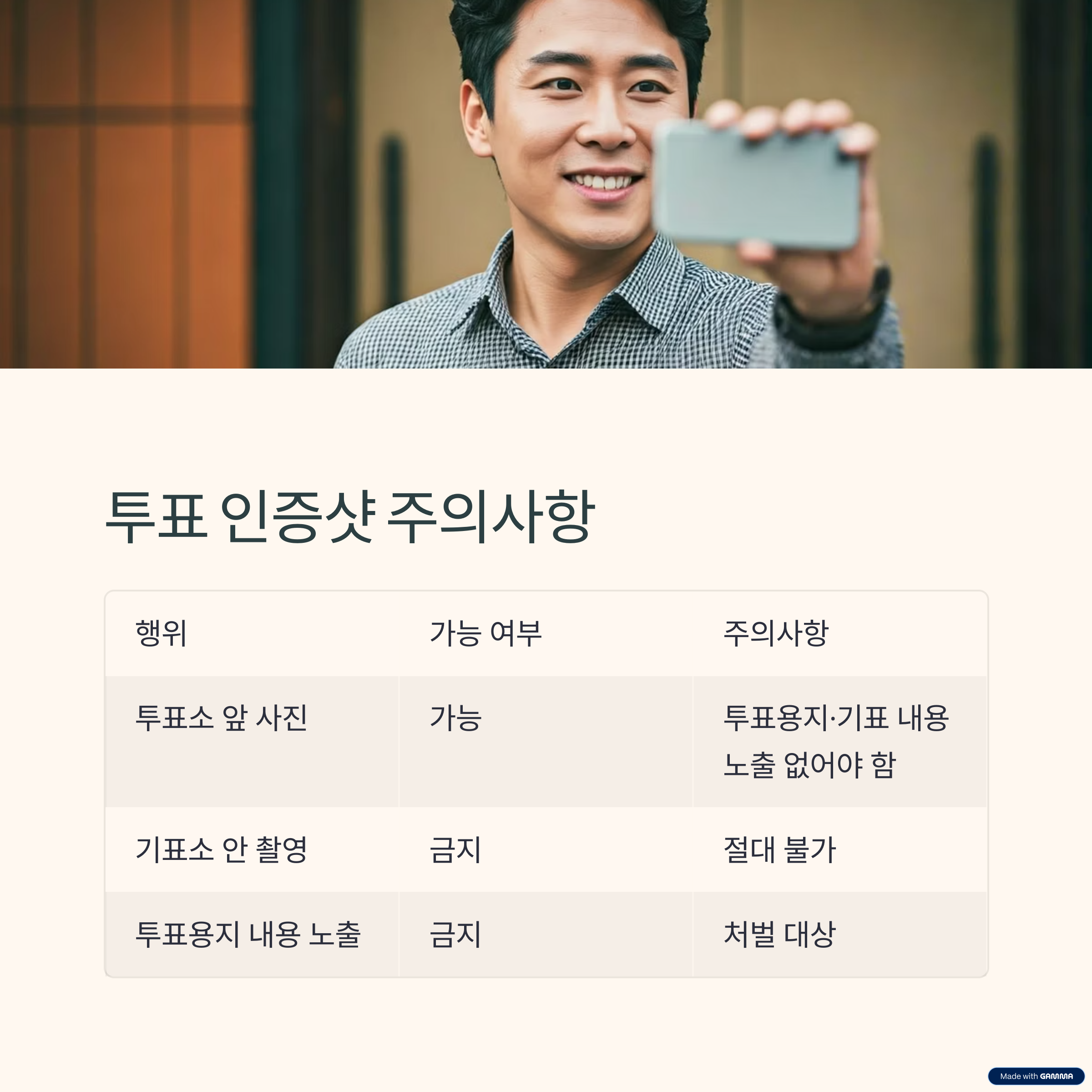 | 기표소 안에서 촬영 | 금지 | 절대 불가 |