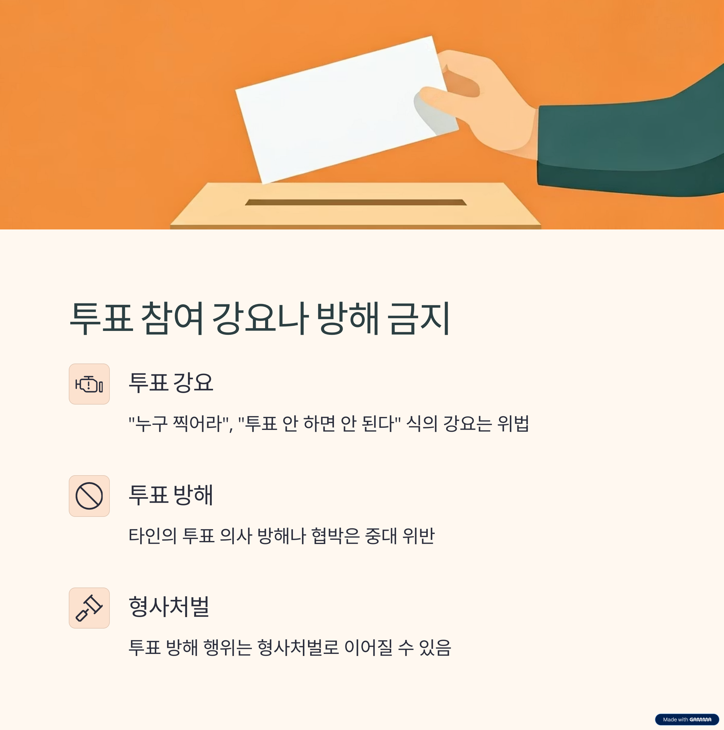 또한 타인의 투표 의사를 방해하거나 협박하는 행위는 형사처벌로 이어질 수 있는 중대 위반입니다.