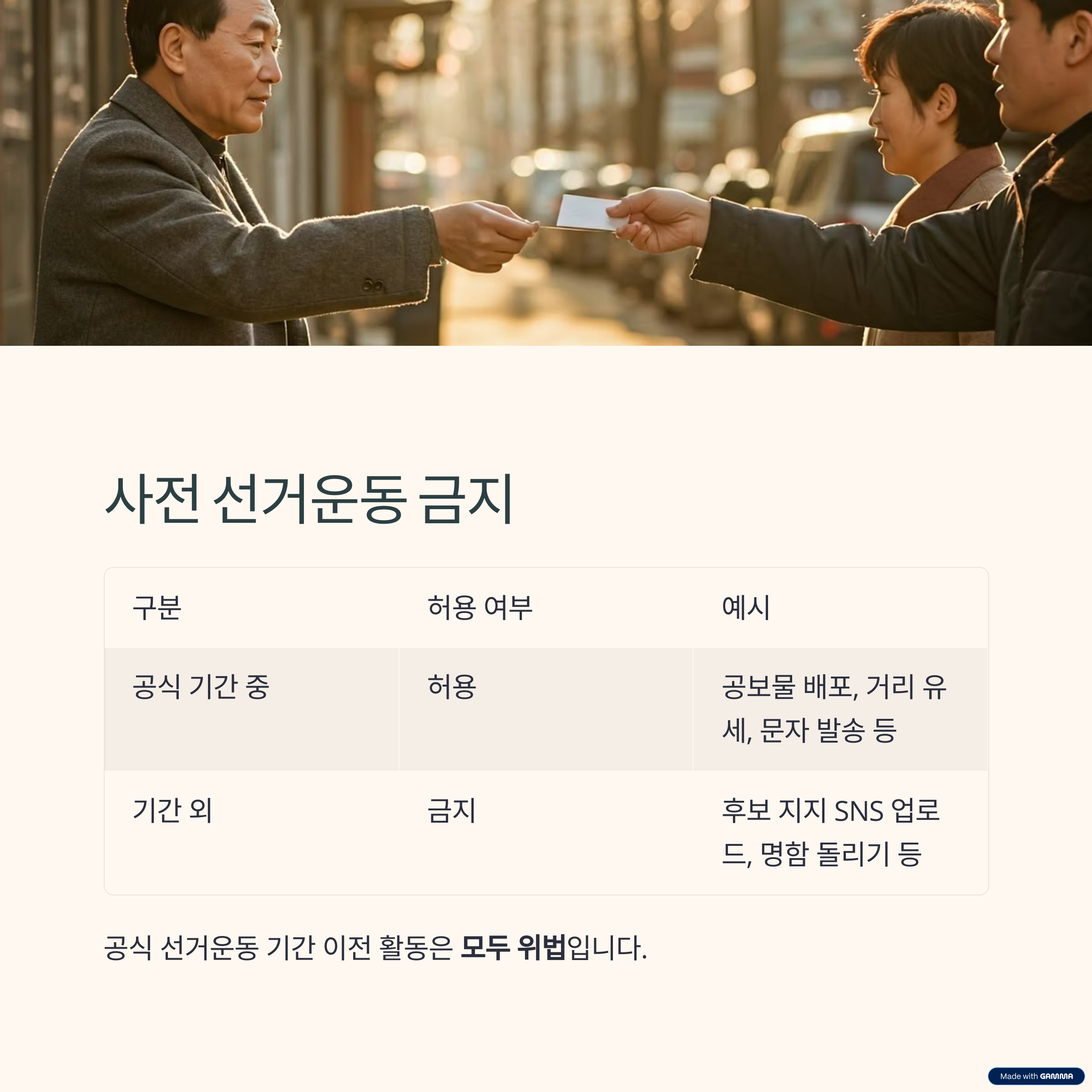 | 공식 기간 중 | 허용 | 공보물 배포, 거리 유세, 문자 발송 등 |