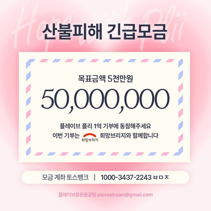 PLLI 산불피해 긴급모금 ✔️ 목표금액 : 5천 만원 이번 기부는 희망브리지와 함께합니다. ※ 기부처는 플레이브와 동일하게 희망브리지로 컨택했습니다. ※ 목표 금액 초과 시 음원총공팀 모금