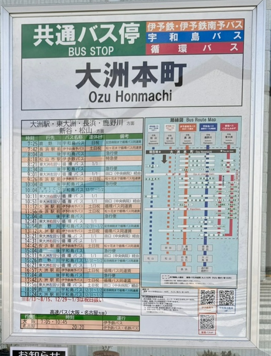 JR 시코쿠 버스 공식 웹사이트 또는 오즈 버스터미널에서 시간표 확인 가능합니다. 시간 맞추는 게 핵심이에요!