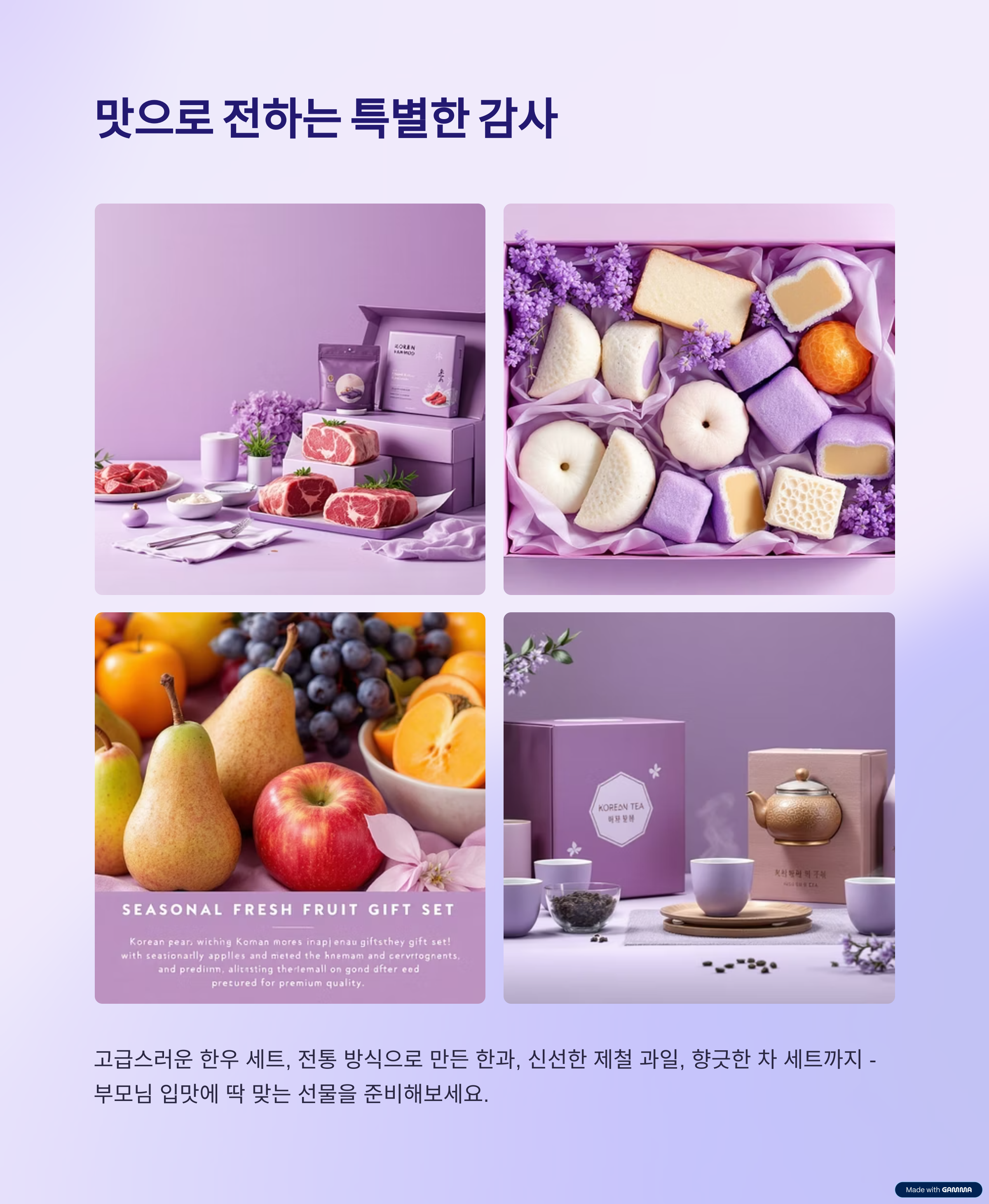 전통 한과 세트, 홍삼정과, 수제 청, 프리미엄 한우, 자연산 생선 세트처럼