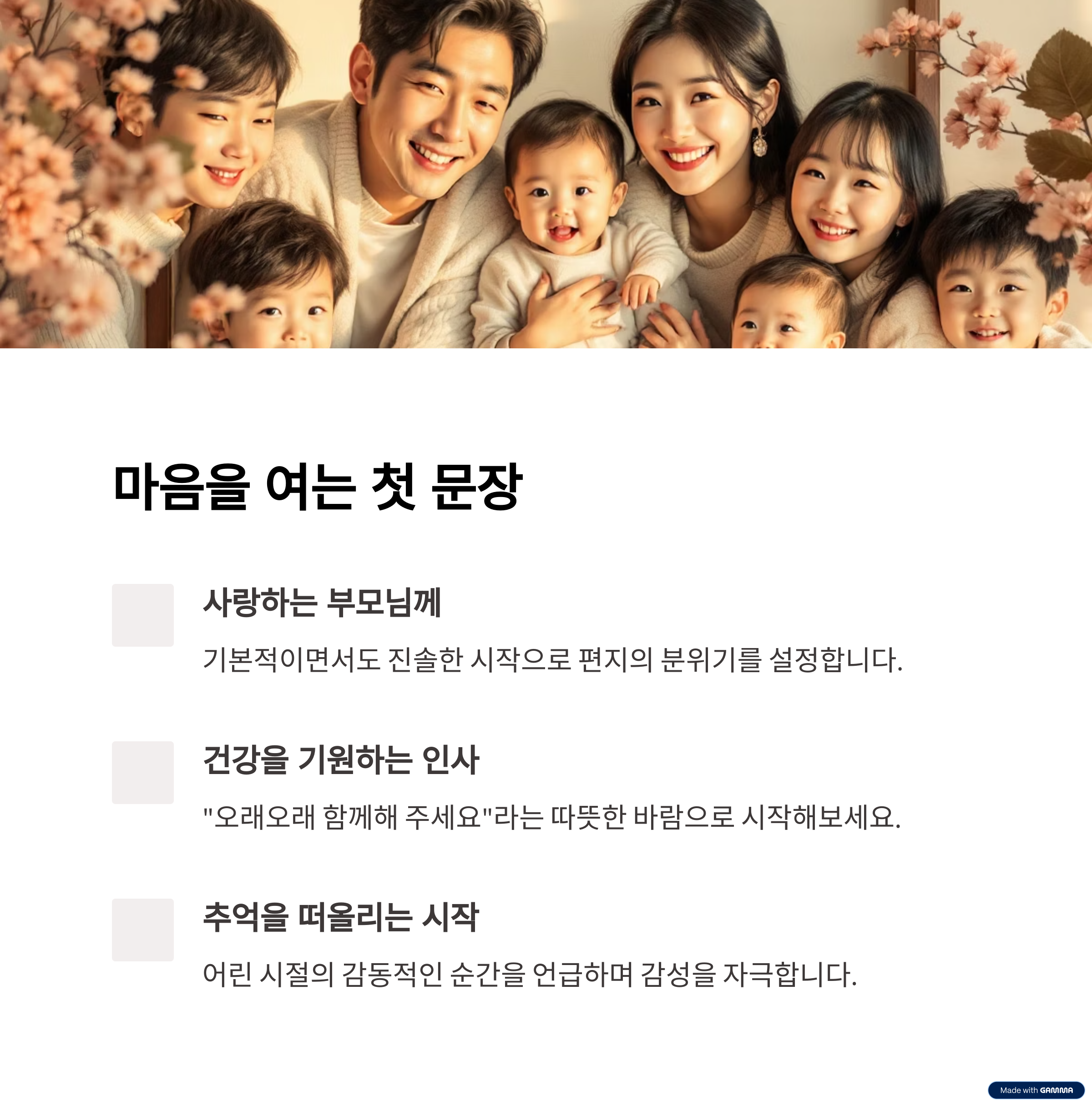 "엄마, 아빠 사랑해요"처럼 평범한 문장도 좋지만, 특별한 기억이나 일상 속 따뜻한 순간을 언급하며 시작하면 진정성이 더욱 느껴집니다.