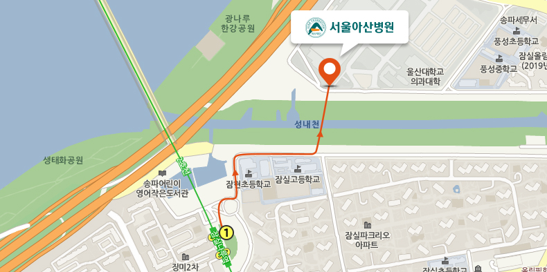 - 잠실나루역 3번 출구 → 4318 버스 승차 → 서울아산병원 동관 하차