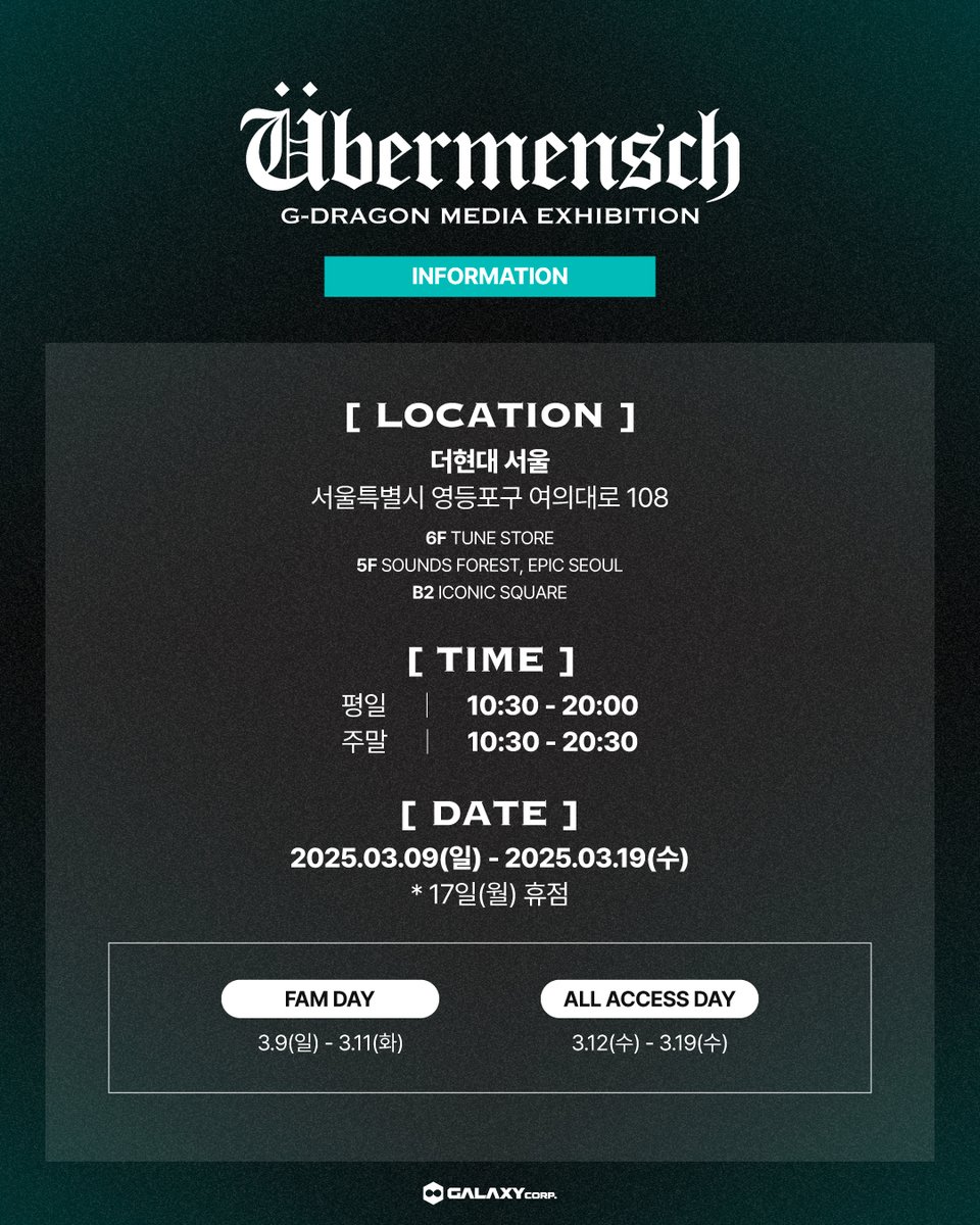 G-DRAGON MEDIA EXHIBITION : Übermensch 기간 : 2025.03.09 (SUN) - 03.19 (WED) 장소 : 더현대 서울 - 6F TUNE - 5F 사운즈 포레스트 & 에픽서울 - B2 아이코닉 스퀘어 #GDRAGON #GD #Übermensch #위버맨쉬 #GDRAGON2025 #fanplusonedo