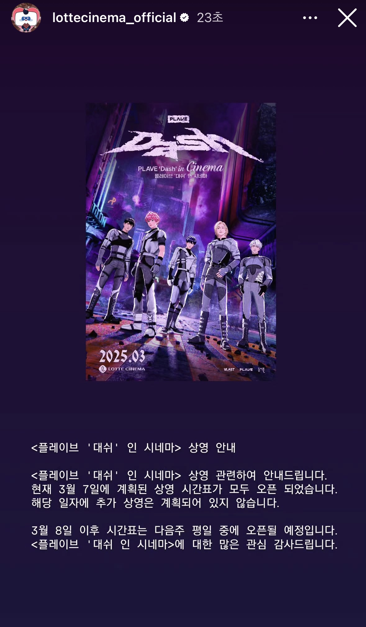 PLAVE 'Dash' in Cinema는 2025년 3월 한 달 동안 전국 롯데시네마에서 상영됩니다! 🎬 극장에서 PLAVE의 감동적인 순간을 직접 느껴보세요. 아래에서 상세한 상영관 정보를 확인할 수 있어요!
