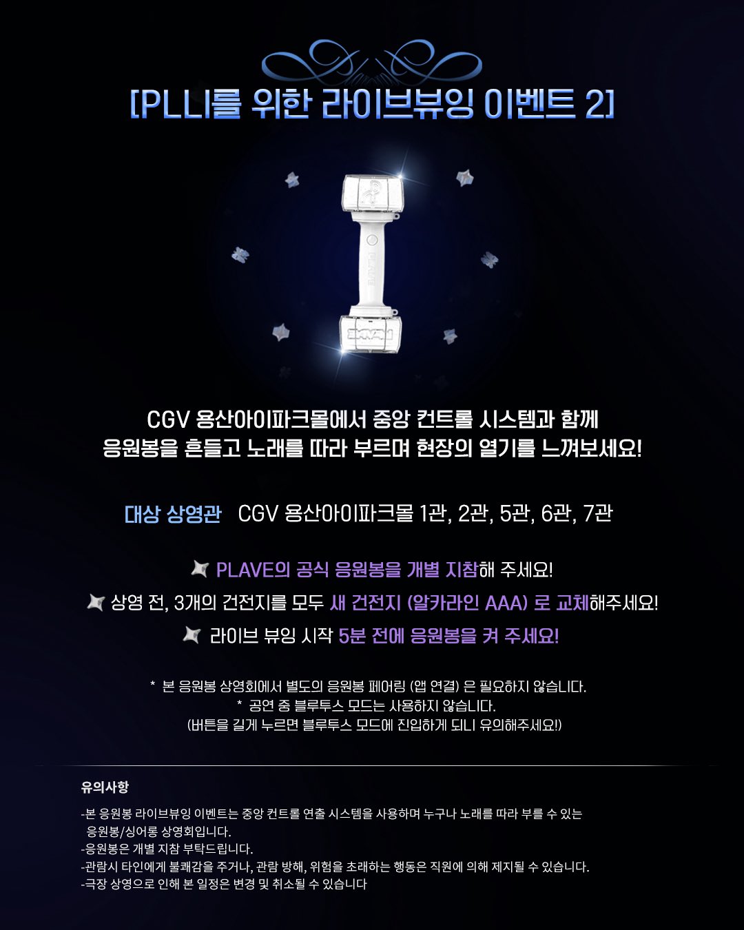 용산아이파크몰 1, 2, 5, 6, 7관에서는 PLAVE 공식 응원봉을 중앙 컨트롤 시스템에 연동하여 콘서트의 열기를 더욱 생생하게 즐기실 수 있어요!
