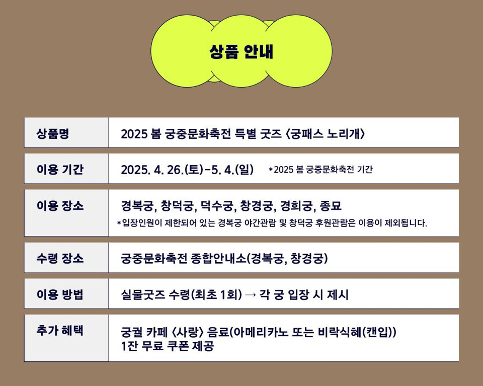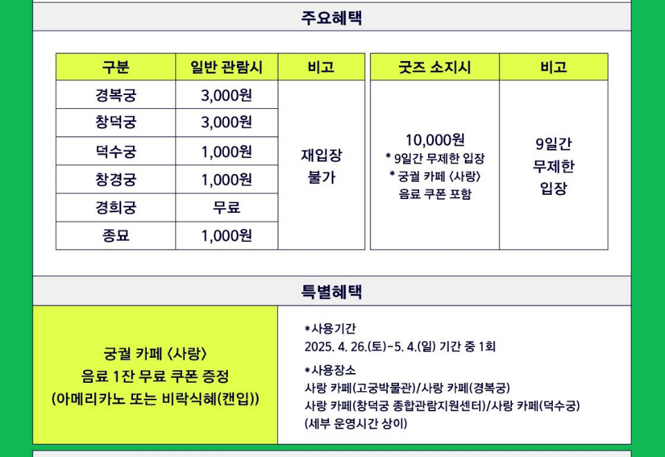 | 경복궁 | 3,000원 | 9일간 무제한 입장 + 음료 쿠폰 제공 |